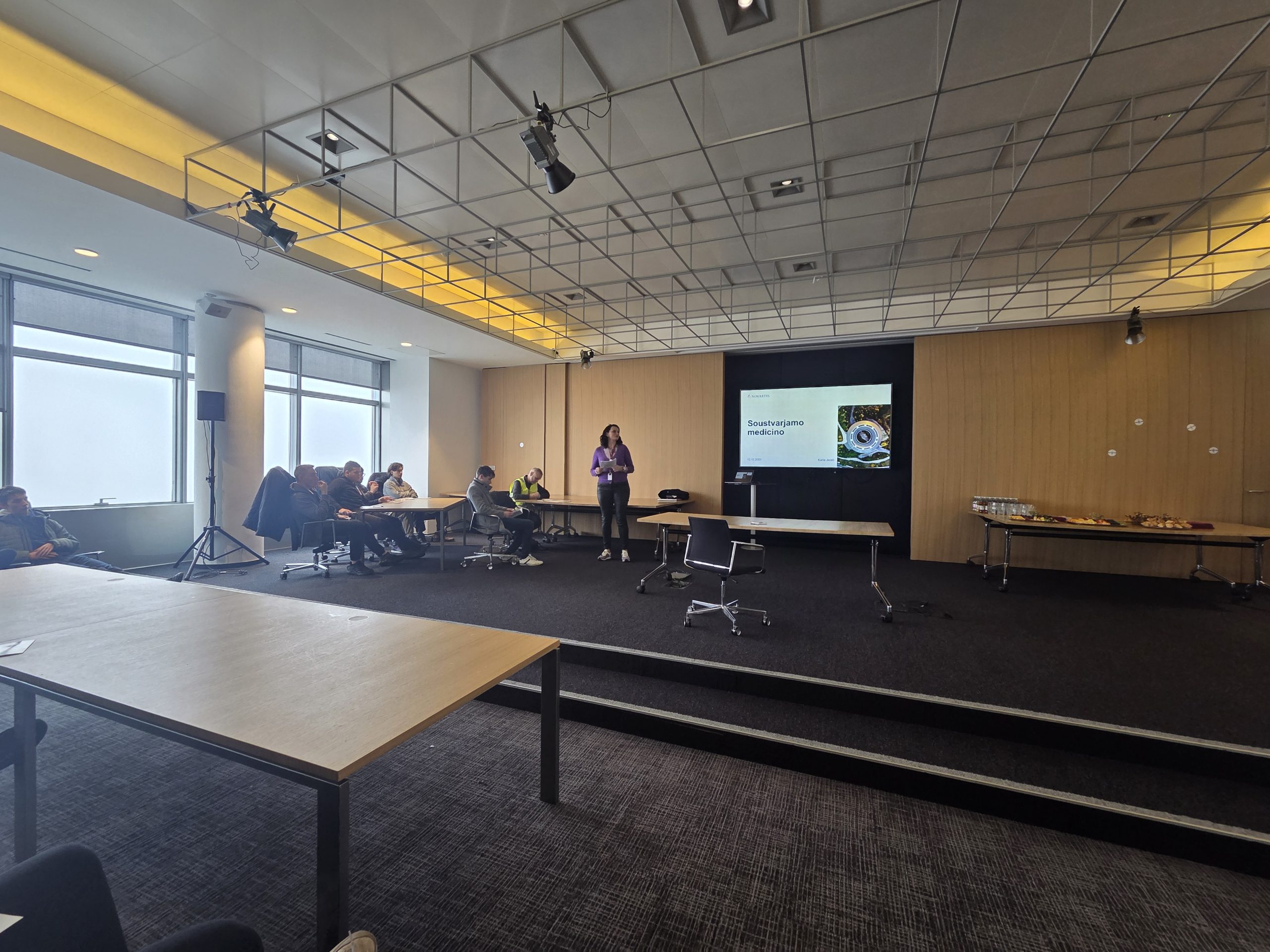 Obisk smo začeli na sedežu podjetja na Verovškovi ulici, kjer nam je gospa Karla Jereb predstavila podjetje Novartis in njegove enote v Sloveniji. Posebno pozornost smo namenili ljubljanski enoti, v kateri smo se tudi nahajali. Dijaki so ob tem spoznali, da so tehniki mehatronike in strojni tehniki zelo iskani ter zaposljivi tudi v farmacevtski industriji.